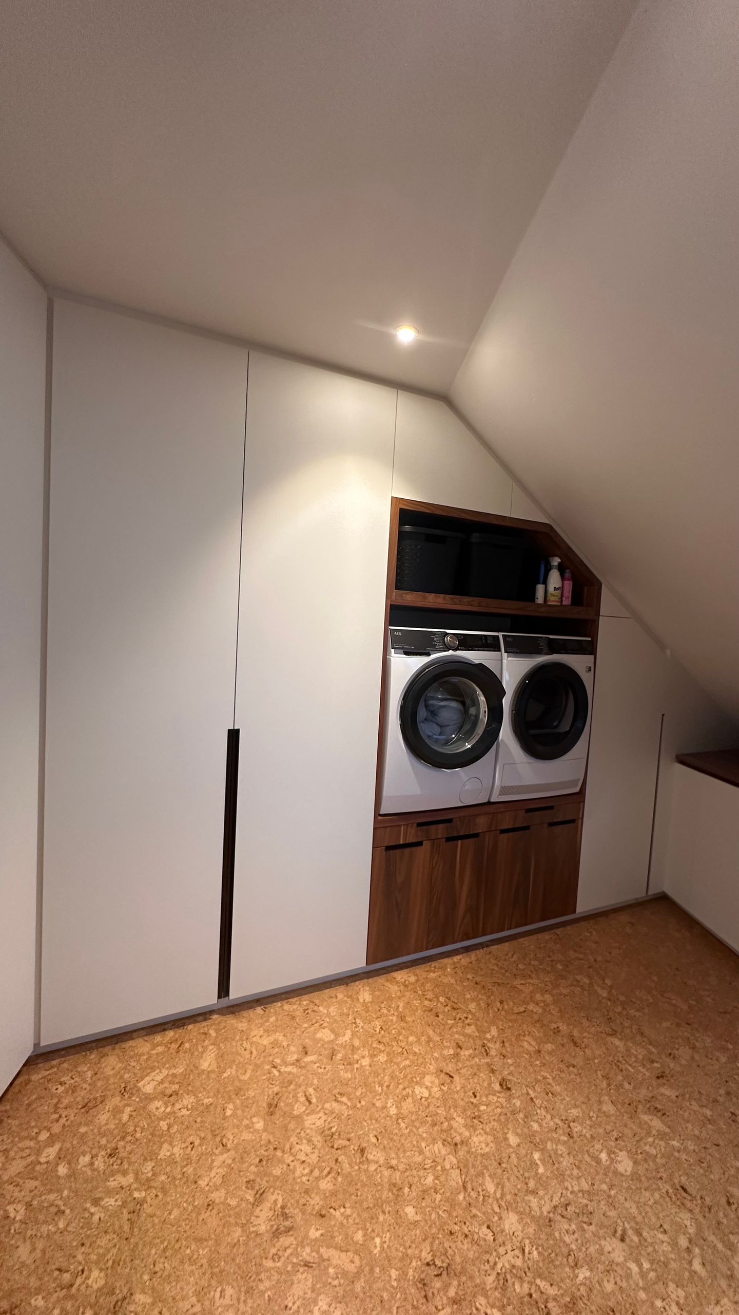 De vloer werd verfraaid met Mortex, een speciale verftechniek, die een unieke textuur en uitstraling geeft. Voor de kasten kozen we voor een combinatie van notelaarfineer en Fenix in gebroken wit, wat zorgt voor een warme en verfijnde look. Het werkblad is een keramische plaat in travertijnlook, gehamerd voor een extra natuurlijke uitstraling. Het kookeiland is voorzien van afgeronde hoeken, die niet alleen esthetisch aantrekkelijk, maar ook 100% functioneel zijn. Bij de afwerking hebben we zelfs aan de kleinste details gedacht, zoals de bediening van de verlichting. Voor de keukenapparatuur hebben we een mix van V-Zug en Bora gekozen, beiden van zeer hoge kwaliteit, om zo de perfecte balans tussen design en functionaliteit te bereiken.